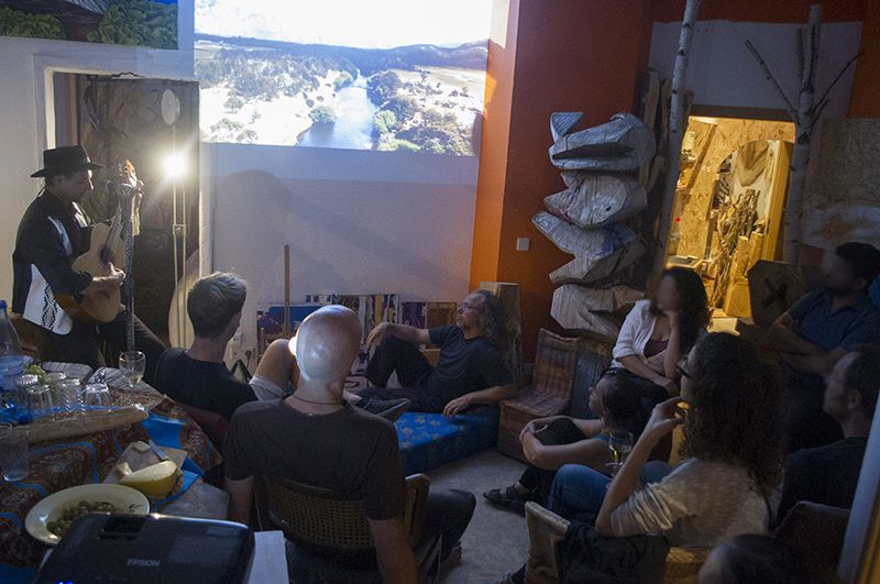 Simultaneously to the interpretation of his songs, he projects videos with images of Patagonia on a screen.